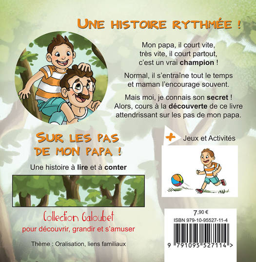Collection Galoubet, pour découvrir, grandir et s’amuser. Une histoire complète avec des jeux et des activités. Mon papa, il court vite, très vite, il court partout, c’est un vrai champion ! Normal, il s’entraîne tout le temps et maman l’encourage souvent. Mais moi, je connais son secret ! Alors, cours à la découverte de ce livre attendrissant sur les pas de mon papa. Une histoire Rythmée ! Thème : Oralisation, liens familiaux.