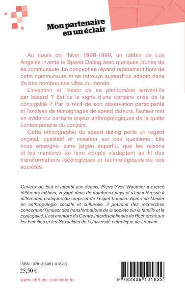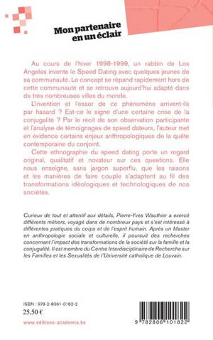 Cette ethnographie du speed dating porte un regard original et novateur sur le paradigme du couple contemporain. Considérant l'émergence et la renommée du speed dating comme la marque de son temps, l'auteur met en évidence les enjeux anthropologiques de la quête contemporaine du conjoint. Il expose, sans jargon superflu, comment les raisons et les manières de faire couple s'adaptent au fil des transformations idéologiques et technologiques de nos sociétés.