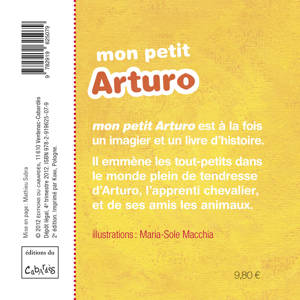 Mon Petit Arturo est à la fois un imagier et un livre d’histoires. Entièrement cartonné, il est d’un format adapté aux petites mains. Il présente Arturo, le petit berger qui veut devenir chevalier, ses amis les animaux, et initie le jeune lecteur aux premiers mots des histoires liées au Moyen Âge.