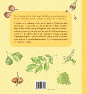 Tu as trouvé une belle feuille lors d'une balade et tu aimerais savoir de quel arbre elle provient ? Dans ce cas, ce livre est fait pour toi ! Il contient une multitude d'infos sur les espèces d'arbres les plus connues de nos régions. Chaque arbre est illustré et décrit en détail : description générale, feuilles, bourgeons, fruits, silhouette en hiver… Cela te permettra d'identifier tout de suite les différentes espèces quand tu te promèneras dans le bois ou le parc. Une place est également prévue pour coller une feuille de l'arbre illustré. Tu pourras aussi noter où et quand tu l'as ramassée. Tu te confectionneras ainsi un magnifique herbier !