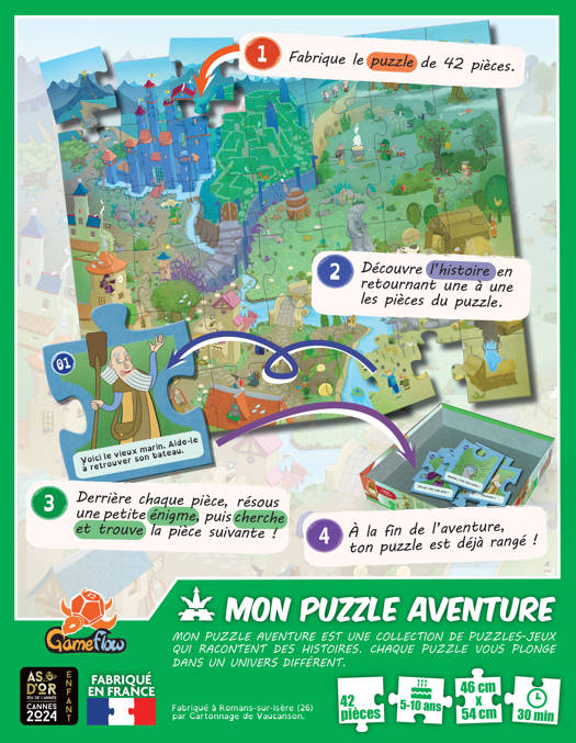 « Mon Puzzle Aventure » est le renouveau d'un classique : le puzzle. Réalise le puzzle puis, une fois les 42 pièces placées, retire-les dans l'ordre et découvre l'histoire en les retournant. Chaque nouvelle pièce donne l'indice pour trouver la suivante.