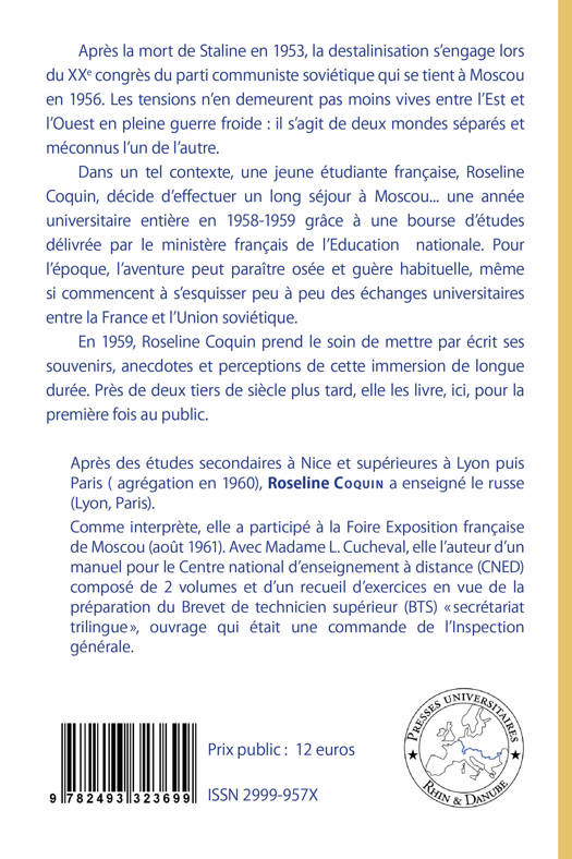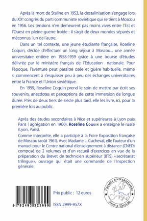 Après la mort de Staline en 1953, la destalinisation s’engage lors du XXe congrès du parti communiste soviétique qui se tient à Moscou en 1956. Les tensions n’en demeurent pas moins vives entre l’Est et l’Ouest en pleine guerre froide : il s’agit de deux mondes séparés et méconnus l’un de l’autre. Dans un tel contexte, une jeune étudiante française, Roseline Coquin, décide d’effectuer un long séjour à Moscou... une année universitaire entière en 1958-1959 grâce à une bourse d’études délivrée par le ministère français de l’Education nationale. Pour l’époque, l’aventure peut paraître osée et guère habituelle, même si commencent à s’esquisser peu à peu des échanges universitaires entre la France et l’Union soviétique. En 1959, Roseline Coquin prend le soin de mettre par écrit ses souvenirs, anecdotes et perceptions de cette immersion de longue durée. Près de deux tiers de siècle plus tard, elle les livre, ici, pour la première fois au public.