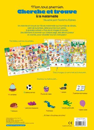 Un cherche et trouve sur l'école maternelle qui fourmille de détails, plein de surprises, idéal pour les tout-petits. 8 grandes scènes, plus de 60 images à trouver. Des éléments à nommer sur chaque page, des décors joyeux et colorés, pour s'éveiller tout en s'amusant ! Parmi de belles scènes illustrées et des images à nommer et à trouver, sauras-tu retrouver... 4 cartables, 2 ballons de foot, 3 pots de craies, 1 canard, 1 partition de musique, 1 hérisson, 1 paire de chaussons, 1 écharpe, 1 doudou grenouille, 1 ballon violet... et bien d'autres encore !