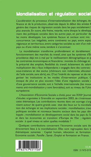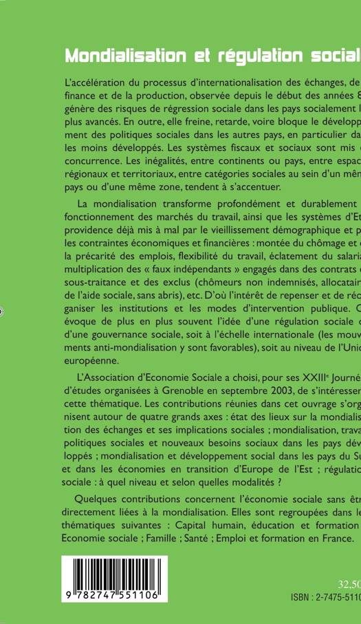 Les contributions réunies dans cet ouvrage s'organisent autour de quatre grands axes : état des lieux sur la mondialisation des échanges et ses implications sociales ; mondialisation, travail, politiques sociales et nouveaux besoins sociaux dans les pays développés ; mondialisation et développement social dans les pays du Sud et dans les économies en transition d'Europe de l'Est ; régulation sociale : à quel niveau et selon quelles modalités ? L'Association d'Économie Sociale a choisi, pour ses XXIIIe Journées d'études organisées à Grenoble en septembre 2003, de s'intéresser à cette thématique.