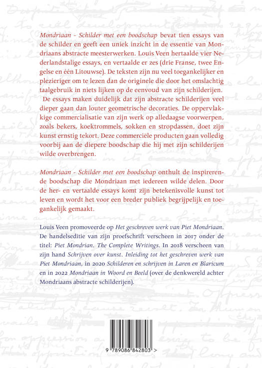 Mondriaan - Schilder met een boodschap bevat tien essays van de schilder en geeft een uniek inzicht in de essentie van Mondriaans abstracte meesterwerken. Louis Veen hertaalde vier Nederlandstalige essays, en vertaalde er zes (drie Franse, twee Engelse en één Litouwse). De teksten zijn nu veel toegankelijker en plezieriger om te lezen dan de originele die door het omslachtig taalgebruik in niets lijken op de eenvoud van zijn schilderijen. De essays maken duidelijk dat zijn abstracte schilderijen veel dieper gaan dan louter geometrische decoraties. De oppervlakkige commercialisatie van zijn werk op alledaagse voorwerpen, zoals bekers, koektrommels, sokken en stropdassen, doet zijn kunst ernstig tekort. Deze commerciële producten gaan volledig voorbij aan de diepere boodschap die hij met zijn schilderijen wilde overbrengen.
