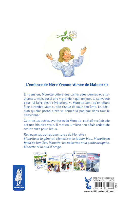 Ce sixième tome des aventures de Monette relate un épisode de l’enfance de Mère Yvonne-Aimée de Jésus, fondatrice des Sœurs Augustines Hospitalières de la Miséricorde de Jésus établies à Malestroit, dans le Morbihan. À l’époque où Monette habitait chez ses grands-parents, elle a vécu des aventures qui sont racontées dans Monette et le général, Monette et le tablier bleu, Monette en habit de lumière et Monette, les noisettes et la petite araignée. La voici désormais en pension : lire Monette et la nuit d’orage. Elle y côtoie des camarades bonnes et attachantes, mais aussi des élèves mal intentionnées qui ont une mauvaise influence sur les autres. C’est le cas d’une « grande » qui la convoque à la prochaine récréation avec d'autres petites élèves pour leur faire des « révélations ». Monette sent que ces propos vont salir leur âme. Ne pouvant dénoncer sa camarade, et après avoir tenté vainement de préserver les autres élèves de ne pas se rendre au « rendez-vous », Monette choisit la fuite