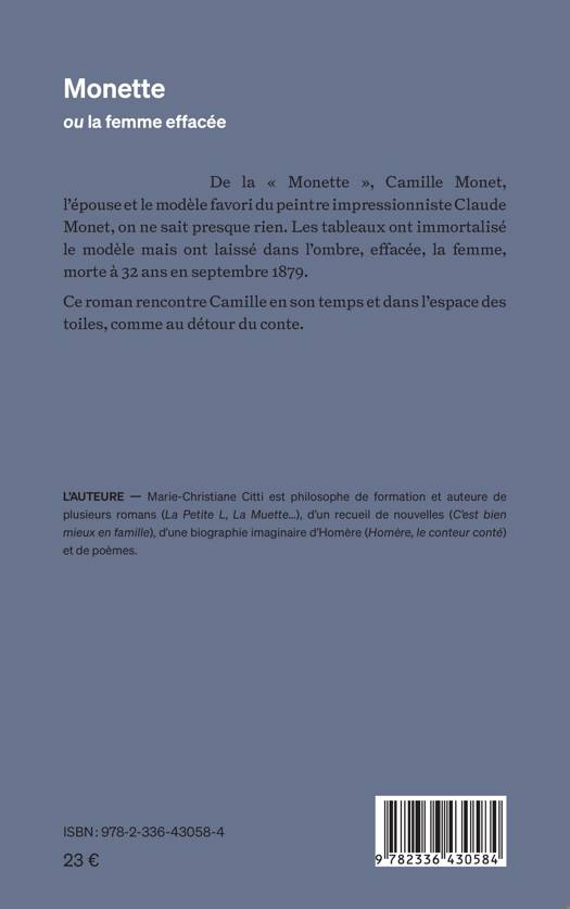 De la Monette, Camille Monet, l'épouse et le modèle favori du peintre impressionniste Claude Monet, on ne sait presque rien. Les tableaux ont immortalisé le modèle mais ont laissé dans l'ombre, effacée, la femme, morte à 32 ans en septembre 1879. Ce roman rencontre Camille en son temps et dans l'espace des toiles, comme au détour du conte.