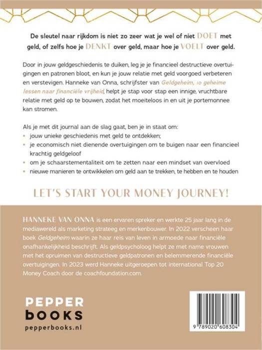 De sleutel naar rijkdom is niet zo zeer wat je wel of niet DOET met geld, of zelfs hoe je DENKT over geld, maar hoe je VOELT over geld. Door in jouw geldgeschiedenis te duiken, leg je je financieel destructieve overtuigingen en patronen bloot, en kun je jouw relatie met geld voorgoed verbeteren en verstevigen. Hanneke van Onna, schrijfster van Geldgeheim, 10 geheime lessen naar financiële vrijheid, helpt je stap voor stap een innige, vruchtbare relatie met geld op te bouwen, zodat het moeiteloos in en uit je portemonnee kan stromen. Als je met dit journal aan de slag gaat, ben je in staat om: • jouw unieke geschiedenis met geld te ontdekken; • je economisch niet dienende overtuigingen om te buigen naar een financieel krachtig geldgeloof • om je schaarstementaliteit om te zetten naar een mindset van overvloed • nieuwe manieren te ontwikkelen om geld aan te trekken, te hebben en te houden