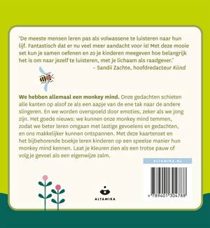 Het goede nieuws is dat je je monkey mind kunt temmen en jezelf daarmee meer rust, focus en aanwezigheid in het hier en nu kunt geven. Met de praktische en inspirerende mindfulnessoefeningen op de kaarten in deze set (met instructieboekje) leren kinderen hoe ze de baas kunnen worden over hun monkey mind - in plaats van andersom. Kom bijvoorbeeld uit je cocon als een moedige vlinder, laat je kleuren zien als een trotse pauw of gebruik je kracht als een reusachtige olifant!