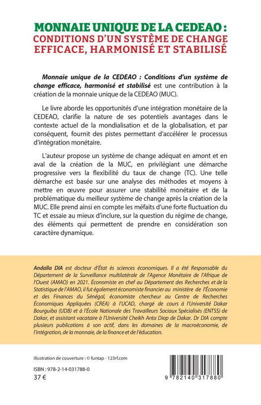 Cet ouvrage est une contribution à la création de la monnaie unique de la CEDEAO. Il aborde les opportunités d'une intégration monétaire de la CEDEAO, clarifie la nature de ses potentiels avantages dans le contexte actuel de la mondialisation et de la globalisation, et par conséquent, fournit des pistes permettant d'accélérer le processus d'intégration monétaire. L'auteur propose un système de change adéquat en amont et en aval de la création de la MUC, en privilégiant une démarche progressive vers la flexibilité du taux de change (TC).