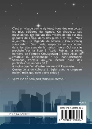 C’est un visage connu de tous, l’une des mascottes les plus célèbres du monde. Ce chapeau, ces moustaches, ont été vus des milliers de fois sur des paquets de chips, dans des pubs à la télé… Mais aujourd’hui, la légende de Monsieur Crousticracq s’assombrit. Des morts suspectes se succèdent dans les coulisses de la maison mère. Qui sera le prochain sur la liste ? Astrid Roblas, la riche héritière de l’empire Crousticracq ? Émile Allias, le créateur du personnage ? Ou Jean-Christophe Schmeps, l’acteur qui l’a incarné dans des publicités des années 80 ? À moins que l’un d’entre eux ne soit l’assassin… Quelqu’un a un compte à régler avec le chapeau melon, mais qui, nom d'une chips ?