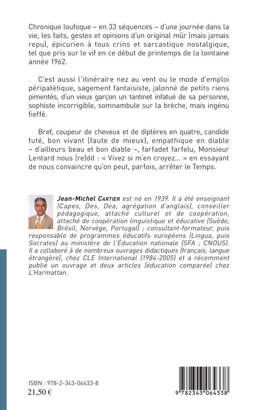 Chronique loufoque - en 33 séquences - d'une journée dans la vie, les faits, gestes et opinions d'un orignal mûr (mais jamais repu), épicurien à tous crins et sarcastique nostalgique, tel que pris sur le vif en ce début de printemps de la lointaine année 1962. Coupeur de cheveux et de diptères en quatre, candide futé, bon vivant, empathique en diable - d'ailleurs beau et bon diable -, farfadet farfelu, Monsieur Lentard nous (re)dit : « Vivez si m'en croyez... »en essayant de nous convaincre qu'on peut, parfois, arrêter le temps.