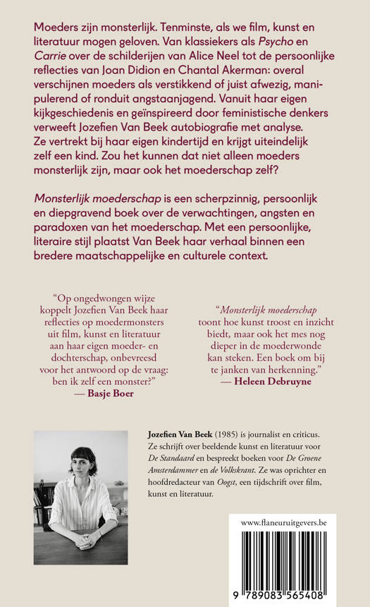 Moeders zijn monsterlijk. Tenminste, als we film, kunst en literatuur mogen geloven. Van klassiekers als Psycho en Carrie over de schilderijen van Alice Neel tot de persoonlijke reflecties van Joan Didion en Chantal Akkerman: overal verschijnen moeders als verstikkend of juist afwezig, manipulerend of ronduit angstaanjagend. Vanuit haar eigen kijkgeschiedenis of geïnspireerd door feministische denkers verweeft Jozefien Van Beek autobiografie met analyse. Ze vertrekt bij haar eigen kindertijd en krijgt uiteindelijk zelf een kind. Zou het kunnen dat niet alleen moeders monsterlijk zijn, maar ook het moederschap zelf?