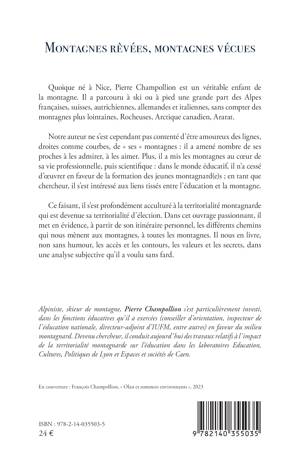 Quoique né à Nice, Pierre Champollion est un véritable enfant de la montagne. Il a parcouru à ski ou à pied une grande part des Alpes françaises, suisses, autrichiennes, allemandes et italiennes, sans compter des montagnes plus lointaines, Rocheuses, Arctique canadien, Ararat. Notre auteur a amené nombre de ses proches à les admirer, à les aimer. Plus, il a mis les montagnes au cœur de sa vie professionnelle, puis scientifique : dans le monde éducatif, il n’a cessé d’œuvrer en faveur de la formation des jeunes montagnard(e)s ; en tant que chercheur, il s’est intéressé aux liens tissés entre l’éducation et la montagne. Ce faisant, il s’est profondément acculturé à la territorialité montagnarde qui est devenue sa territorialité d’élection. Dans cet ouvrage passionnant, il met en évidence, à partir de son itinéraire personnel, les différents chemins qui nous mènent aux montagnes, à toutes les montagnes. Il nous en livre, non sans humour, les accès et les contours, les valeurs et les secrets, dans une analyse subjective qu’il a voulue sans fard.