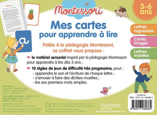 Fidèle à la pédagogie Montessori, ce coffret vous propose : • le matériel sensoriel inspiré par la pédagogie Montessori pour apprendre à lire dès 3 ans : 29 cartes rugueuses, 48 cartes images autocorrectives et 60 lettres mobiles. • 10 règles de jeux de difficulté très progressive, pour : - apprendre le son et l’écriture de chaque lettre ; - s’amuser à faire des dictées muettes ; - lire ses premiers mots simples !