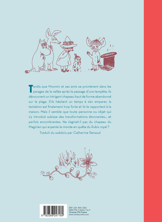 Tandis que Moomin et ses amis se promènent dans les parages de la vallée après le passage d'une tempête, ils découvrent un intrigant chapeau haut de forme abandonné sur la plage. S'ils hésitent un temps à s'en emparer, la tentation est finalement trop forte et ils le rapportent à la maison. Mais il semble que toute personne ou objet qui s'y introduit subisse des transformations étonnantes... et parfois encombrantes. Ne s'agirait-il pas du chapeau du Magicien qui arpente le monde en quête du Rubis royal ?