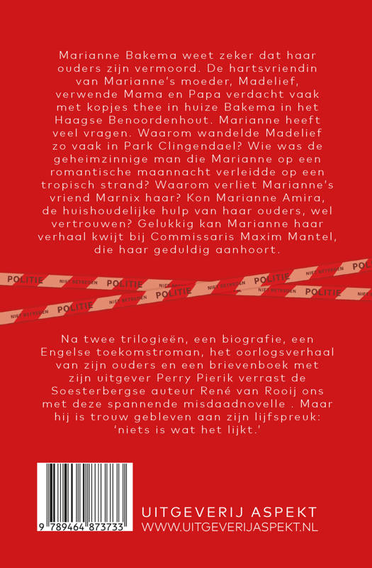 Na twee trilogieën, een biografie, een Engelse toekomstroman, het oorlogsverhaal van zijn ouders en een brievenboek met zijn uitgever Perry Pierik verrast de Soesterbergse auteur René van Rooij ons met deze spannende misdaadnovelle . Maar hij is trouw gebleven aan zijn lijfspreuk: ‘niets is wat het lijkt.’