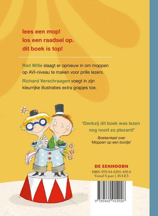 Een moppenboek voor beginnende lezers op AVI-E3. Lach mee met Sam, Noor en hun familie. Vanaf 6 jaar. Kinderen ontdekken het plezier van lezen met dit bijzondere boek.Na de twee succesvolle moppenboeken Moppen op een bordje en Een mop met een bij bij slaagt Riet Wille er opnieuw in om moppen, raadsels en grapjes op AVI-niveau te vertalen voor prille lezers. Richard Verschraagen voegt in zijn kleurrijke illustraties extra grapjes toe.