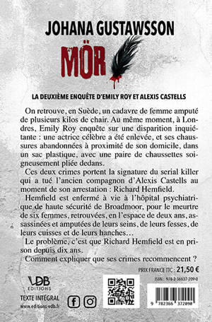 On retrouve, en Suède, un cadavre de femme amputé de plusieurs kilos de chair. Au même moment, à Londres, Emily Roy enquête sur une disparition inquiétante : une actrice célèbre a été enlevée, et ses chaussures abandonnées à proximité de son domicile, dans un sac plastique, avec une paire de chaussettes soigneusement pliée dedans. Ces deux crimes portent la signature du serial killer qui a tué l’ancien compagnon d’Alexis Castells au moment de son arrestation : Richard Hemfield. Hemfield est enfermé à vie à l’hôpital psychiatrique de haute sécurité de Broadmoor, pour le meurtre de six femmes, retrouvées, en l’espace de deux ans, assassinées et amputées de leurs seins, de leurs fesses, de leurs cuisses et de leurs hanches… Le problème, c’est que Richard Hemfield est en prison depuis dix ans. Comment expliquer que ses crimes recommencent ?
