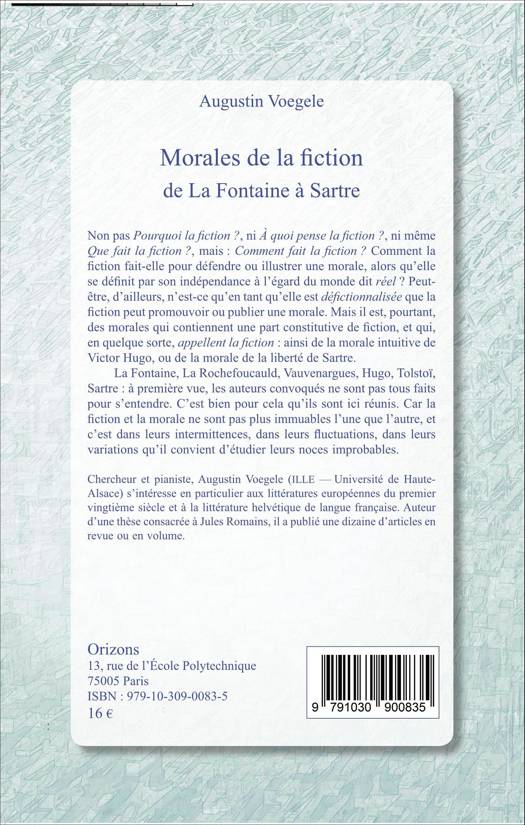 Comment la fiction fait-elle pour défendre ou illustrer une morale, alors qu'elle se définit par son indépendance à l'égard du monde dit réel ? La Fontaine, La Rochefoucauld, Vauvenargues, Hugo, Tolstoï, Sartre sont ici réunis. La fiction et la morale ne sont pas plus immuables l'une que l'autre, et c'est dans leurs intermittences, dans leurs fluctuations, dans leurs variations qu'il convient d'étudier leurs noces improbables. Chercheur et pianiste, Augustin Voegele s'intéresse en particulier aux littératures européennes du premier vingtième siècle. Il a soutenu une thèse consacrée à Jules Romains.