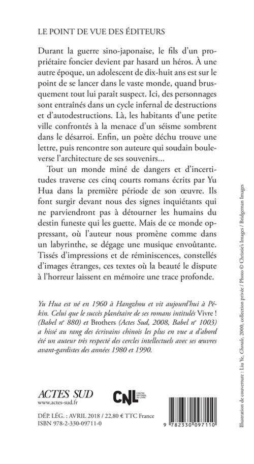 Tout un monde miné de dangers et d'incertitudes traverse ces cinq courts romans écrits par Yu Hua dans la première période de son oeuvre. Ils font surgir devant nous des signes inquiétants qui ne parviendront pas à détourner les humains du destin funeste qui les guette. Mais de ce monde oppressant, où l'auteur nous promène comme dans un labyrinthe, se dégage une musique envoûtante. Tissés d'impressions et de réminiscences, constellés d'images étranges, ces textes où la beauté le dispute à l'horreur laissent en mémoire une trace profonde.