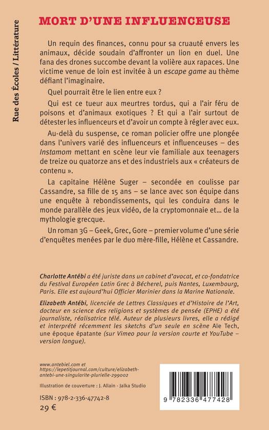 Un requin des finances, connu pour sa cruauté envers les animaux, décide soudain d'affronter un lion en duel. Une fana des drones succombe devant la volière aux rapaces. Une victime venue de loin est invitée à un escape game au thème défiant l'imaginaire. Quel pourrait être le lien entre eux ? Qui est ce tueur aux meurtres tordus, qui a l'air féru de poisons et d'animaux exotiques ? Et qui a l'air surtout de détester les influenceurs et d'avoir un compte à régler avec eux. Au-delà du suspense, ce roman policier offre une plongée dans l'univers varié des influenceurs et influenceuses - des Instamom mettant en scène leur vie familiale aux teenagers de treize ou quatorze ans et des industriels aux créateurs de contenu . La capitaine Hélène Suger - secondée en coulisse par Cassandre, sa fille de 15 ans - se lance avec son équipe dans une enquête à rebondissements, qui les conduira dans le monde parallèle des jeux vidéo, de la cryptomonnaie et... de la mythologie grecque. Un roman 3G - Geek, Grec, Gore - premier volume d'une série d'enquêtes menées par le duo mère-fille, Hélène et Cassandre.
