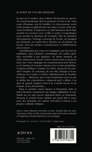 Le jour de la rentrée, deux enfants découvrent un spectacle cauchemardesque dans le gymnase de leur école. Cinq corps d'hommes ont été mutilés à la tronçonneuse avant d'être pendus au plafond dans une mise en scène d'une précision terrifiante. L'inspecteur en chef Simonsen interrompt aussitôt ses vacances avec sa fille et rentre à Copenhague pour prendre la direction de l'enquête. Dès les premiers interrogatoires, l'étrange concierge de l'école, un marginal qui dissimule un esprit retors derrière un alcoolisme de façade, tient des propos contradictoires et délibérément provocateurs... L'identification des corps est compliquée par leur état de mutilation, mais l'ablation systématique des parties génitales ressemble à une signature. Au même moment, un riche entrepreneur victime d'abus sexuels dans sa jeunesse lance une vaste campagne de communication pour dénoncer le laxisme de la justice danoise vis-à-vis des pédophiles. L'opinion publique s'empare du débat, menaçant de parasiter l'enquête. Le concierge, de son côté, échappe à la surveillance de la police et achève définitivement de brouiller les pistes... Simonsen, qui a trop d'expérience pour ne pas se méfier des coïncidences, comprend qu'il a affaire à un plan de grande ampleur dont il ne connaît encore ni les tenants, ni les aboutissants... Dans ce premier roman intense et foisonnant, Lotte et Søren Hammer construisent une intrigue millimétrée et roublarde sur un sujet encore largement tabou au Danemark. Dressant le portrait d'une opinion qui prend fait et cause pour des meurtriers, les auteurs renvoient le lecteur à ses propres certitudes éthiques.