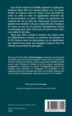 Lors d’une réunion de famille piquante et grinçante, madame Hope fête ses soixante-quinze ans. La soirée festive va tourner court en raison d’une nouvelle loi, votée la veille et mise en application derechef par le gouvernement en place. Toutes les personnes de soixante-dix ans et plus ont vingt-quatre heures pour quitter leurs familles et foyers respectifs afin d’intégrer le Centre ou une de ses annexes spécialement conçus et aménagés pour elles. Toute leur vie doit rentrer dans une valise de dix kilos. Alors que dans certaines contrées, les seniors sont les bibliothèques vivantes, la mémoire des peuples et le fil d’Ariane entre les générations, ici et maintenant, que faisons-nous pour accompagner jusqu’au bout du chemin nos proches les plus âgés ?