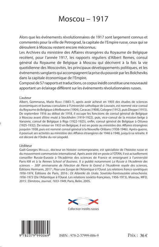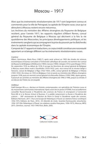 Alors que les événements révolutionnaires de 1917 sont largement connus et commentés pour la ville de Petrograd, la capitale de l'Empire russe, ceux qui se déroulent à Moscou restent encore méconnus. Les archives du ministère des Affaires étrangères du Royaume de Belgique recèlent, pour l'année 1917, les rapports réguliers d'Albert Remes, consul général du Royaume de Belgique à Moscou qui décrivent à la fois la vie quotidienne des Moscovites, les principaux développements politiques, et les événements sanglants qui accompagnent la prise du pouvoir par les Bolcheviks dans la capitale économique de l'Empire. Composé de 57 rapports et traductions, ce corpus inédit constitue une nouveauté apportant un éclairage différent sur les événements révolutionnaires russes.