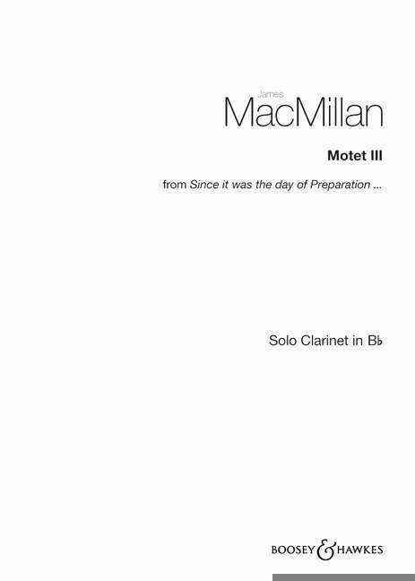 Extended instrumental solo taken from MacMillan’s 70–90-minute "Since it was the day of Preparation … " for voices & ensemble, commissioned by the Hebrides Ensemble, Edinburgh International Festival, Soli Deo Gloria and Kings Place, and first performed by the Hebrides Ensemble at the 2012 Edinburgh Festival. The parent work sets the Resurrection narratives from St John’s Gospel. Five instrumental solos for different instruments (theorbo, cello, clarinet, harp, horn) are reproduced unabridged. They serve as prologue and interludes at respective points of the work. Instrumentation: clarinet