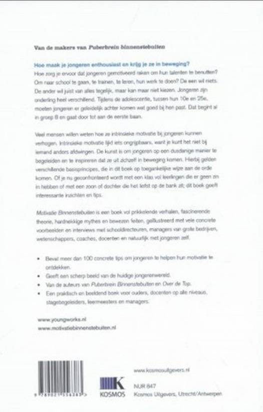 Het succesvolle boek Puberbrein binnenstebuiten legt uit hoe het puberbrein werkt, Motivatie binnenstebuiten is het praktische vervolgboek. Want hoe raken jongeren gemotiveerd iets te willen en te bereiken? De een lijkt niets te willen. De ander wil juist van alles tegelijk en kan maar niet kiezen. Jongeren zijn onderling heel verschillend. De vraag wat iemand motiveert is dan ook heel persoonlijk. In Motivatie binnenstebuiten gaan we daarom op zoek naar de code van motivatie, een heel actueel thema in opvoeding en onderwijs. Een heel praktisch boek voor ouders, docenten, stagebegeleiders, leermeesters en managers.