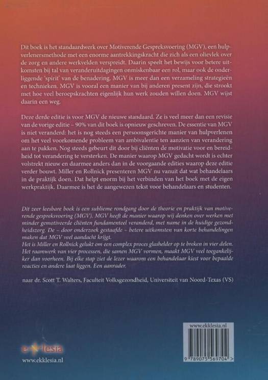 Deze derde editie is voor MGV de nieuwe standaard. Ze is veel meer dan een revisie van de vorige editie - 90% van dit boek is opnieuw geschreven. De essentie van MGV is niet veranderd: het is nog steeds een persoonsgerichte manier van hulpverlenen om het veel voorkomende probleem van ambivalentie ten aanzien van verandering aan te pakken. Nog steeds gebeurt dit door bij cliënten de motivatie voor en bereidheid tot verandering versterken. De manier waarop MGV gedacht wordt is echter volstrekt nieuw en daarmee anders dan de voorgaande edities waarop deze editie verder bouwt. Miller en Rollnick presenteren MGV nu vanuit dat wat behandelaars in de praktijk doen. Dat helpt enorm bij het verbinden van het boek met de eigen werkpraktijk. Daarmee is het de aangewezen tekst voor behandelaars en studenten.