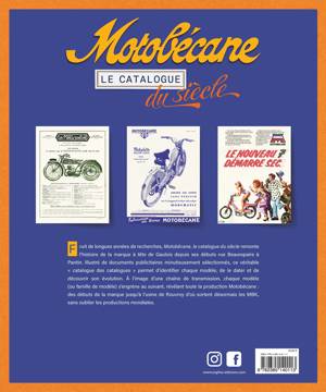Fruit de longues années de recherches, Motobécane, le catalogue du siècle remonte l’histoire de la marque à tête de Gaulois depuis ses débuts rue Beaurepaire à Pantin. Illustré de documents publicitaires minutieusement sélectionnés, ce véritable « catalogue des catalogues » permet d’identifier chaque modèle, de le dater et de découvrir son évolution. À l’image d’une chaîne de transmission, chaque modèle (ou famille de modèle) s’engrène au suivant, révélant toute la production Motobécane : des débuts de la marque jusqu’à l’usine de Rouvroy d’où sortent désormais les MBK, sans oublier les productions mondiales.