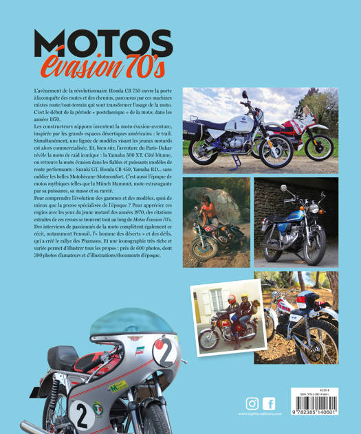 Pour comprendre l’évolution des gammes et des modèles, quoi de mieux que la presse spécialisée de l’époque ? Pour apprécier ces engins avec les yeux du jeune motard des années 1970, des citations extraites de ces revues se trouvent tout au long de Motos Évasion 70’s. Des interviews de passionnés de la moto complètent également ce récit, notamment Fenouil, l’« homme des déserts » et des défis, qui a créé le rallye des Pharaons. Et une iconographie très riche et variée permet d’illustrer tous les propos : près de 600 photos, dont 380 photos d’amateurs et d’illustrations/documents d’époque.
