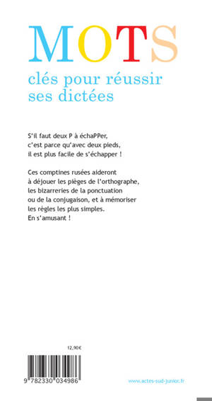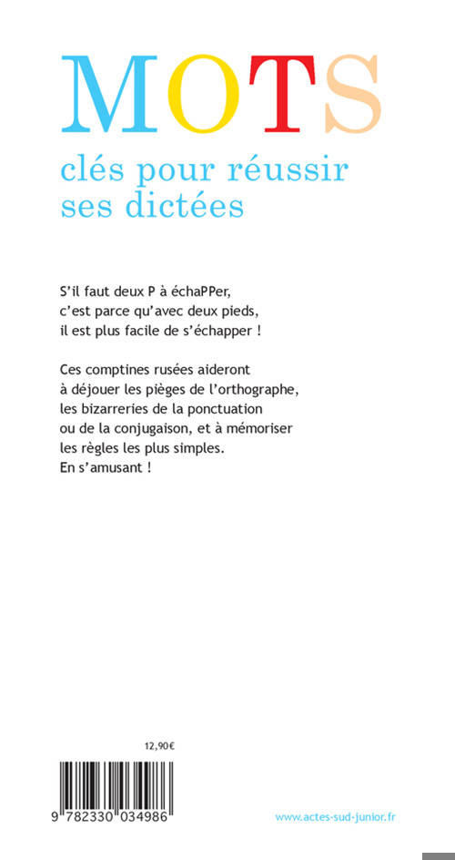 S'il faut deux P à échaPPer, c'est parce qu'avec deux pieds, il est plus facile de s'échapper ! Ces comptines rusées aideront à déjouer les pièges de l'orthographe, les bizarreries de la ponctuation ou de la conjugaison, et à mémoriser les règles les plus simples. Véritable "long-seller" d'Actes Sud Junior depuis sa parution en 2000, voici une nouvelle édition rajeunie pour faire zéro faute à ses dictées!
