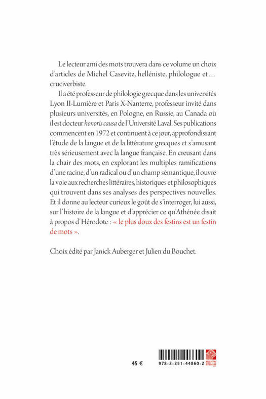 Le lecteur ami des mots trouvera dans ce volume un choix d’articles de Michel Casevitz, helléniste, philologue et… cruciverbiste.