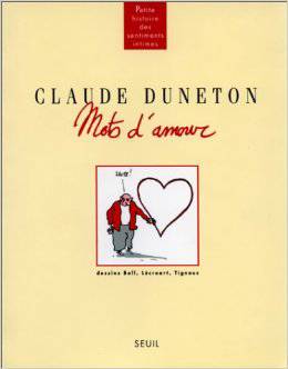 L'idée c'est que je vais faire au travers des Mots d'amour une petit histoire décorative du sentiment amoureux - l'évolution des manières depuis une société ancienne où l'amour était "plein de doigts", le passage à une société "policée", intériorisée jusqu'à la gueule où l'amour est devenu... des ondes, des vibrations, ornées de tout menus attouchements... Et où, oui-da! les maux d'amour sont devenus vraiment mortels... Un truc comme ça... aussi drôle que faire se peut." Claude Duneton