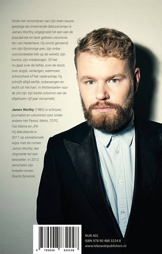 Sinds het verschijnen van zijn even rauwe, geestige als innemende debuutroman is James Worthy uitgegroeid tot een van de populairste en best gelezen columnisten van Nederland. Hij wordt geroemd om zijn fijnzinnige pen, zijn onbevooroordeelde blik op de wereld, zijn humor, zijn mededogen. Of het nu gaat over de liefde, over de dood, over angst, verlangen, weemoed, schoonheid of het vaderschap; hij schrijft altijd eerlijk, onbevangen en recht uit het hart. In Mottenballen voor de ziel zijn zijn beste columns van de afgelopen vijf jaar verzameld.