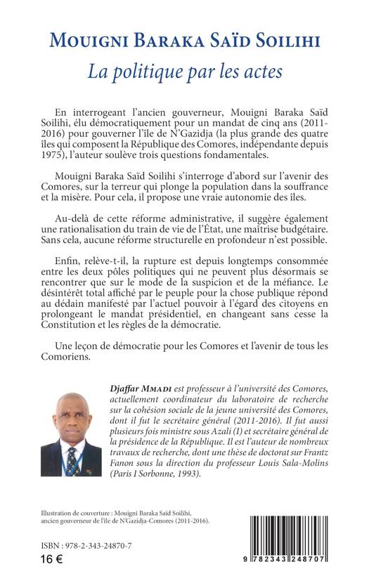 En interrogeant l’ancien gouverneur, Mouigni Baraka Saïd Soilihi, élu démocratiquement pour un mandat de cinq ans (2011- 2016) pour gouverner l’île de N’Gazidja (la plus grande des quatre îles qui composent la République des Comores, indépendante depuis 1975), l’auteur soulève trois questions fondamentales. Mouigni Baraka Saïd Soilihi s’interroge d’abord sur l’avenir des Comores, sur la terreur qui plonge la population dans la sou¬ffrance et la misère. Pour cela, il propose une vraie autonomie des îles. Au-delà de cette réforme administrative, il suggère également une rationalisation du train de vie de l’État, une maîtrise budgétaire. Sans cela, aucune réforme structurelle en profondeur n’est possible. Enfin, relève-t-il, la rupture est depuis longtemps consommée entre les deux pôles politiques qui ne peuvent plus désormais se rencontrer que sur le mode de la suspicion et de la méfiance.