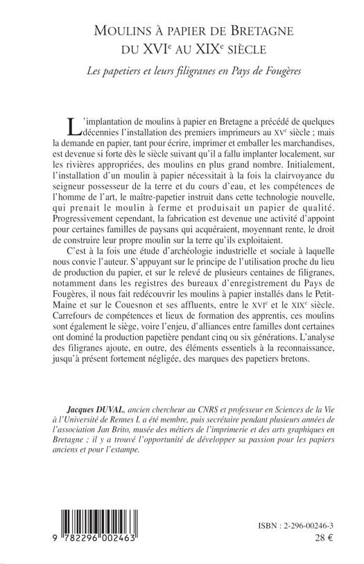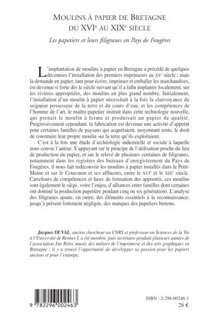 L'implantation de moulins à papier en Bretagne a précédé de quelques décennies l'installation des premiers imprimeurs au XVème siècle ; mais la demande en papier, tant pour écrire, imprimer et emballer les marchandises, est devenue si forte dès le siècle suivant qu'il a fallu implanter localement, sur les rivières appropriées, des moulins en plus grand nombre. Carrefours de compétences et lieux de formation des apprentis, ces moulins sont également le siège, voire l'enjeu, d'alliances entre familles dont certaines ont dominé la production papetière pendant cinq ou six générations.