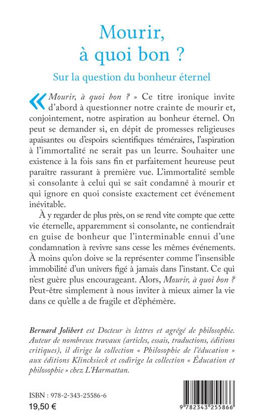 Mourir, à quoi bon ? Ce titre ironique invite d’abord à questionner notre crainte de mourir et, conjointement, notre aspiration au bonheur éternel. On peut se demander si, en dépit de promesses religieuses apaisantes ou d’espoirs scientifiques téméraires, l’aspiration à l’immortalité ne serait pas un leurre. Souhaiter une existence à la fois sans fin et parfaitement heureuse peut paraître rassurant à première vue. L’immortalité semble si consolante à celui qui se sait condamné à mourir et qui ignore en quoi consiste exactement cet événement inévitable. À y regarder de plus près, on se rend vite compte que cette vie éternelle, apparemment si consolante, ne contiendrait en guise de bonheur que l’interminable ennui d’une condamnation à revivre sans cesse les mêmes événements. À moins qu’on ne doive se la représenter comme l’insensible immobilité d’un univers figé à jamais dans l’instant. Ce qui n’est guère plus encourageant. Alors, Mourir, à quoi bon ? Peut-être simplement à nous inviter à mieux aimer la vie dans ce qu’elle a de fragile et d’éphémère.