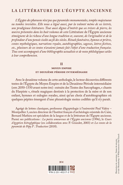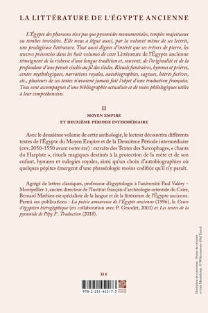 L'Egypte des pharaons n'est pas que pyramides monumentales, temples majestueux ou tombes inviolees. Elle nous a legue aussi, par la volonte meme de ses lettres, une prodigieuse litterature. Tout aussi dignes d'interet que ses tresors de pierre, les oeuvres presentees dans les huit volumes de cette Litterature de l'Egypte ancienne temoignent de la richesse d'une longue tradition et, souvent, de l'originalite et de la profondeur d'une pensee ciselee au fil des siecles. Rituels funeraires, hymnes et prieres, contes mythologiques, narrations royales, autobiographies, sagesses, lettres fictives, etc., plusieurs de ces textes n'avaient jamais fait l'objet d'une traduction francaise. Tous sont accompagnes d'une bibliographie actualisee et de notes philologiques utiles a leur comprehension. Avec le deuxieme volume de cette anthologie, le lecteur decouvrira differents textes de l'Egypte du Moyen Empire et de la Deuxieme Periode intermediaire (env. 2050-1550 avant notre ere): extraits des Textes des Sarcophages, chants du Harpiste , rituels magiques destines a la protection de la mere et de son enfant, hymnes et eulogies royales, ainsi qu'un choix d'autobiographies ou quelques pepites emergent d'une phraseologie moins codifiee qu'il n'y parait.