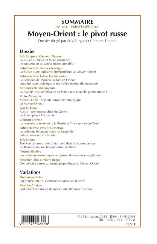 La Russie est-elle devenue la nouvelle puissance pivot du Moyen-Orient ? Ce numéro spécial entend apporter de nouvelles contributions aux débats suscités par le retour de la Russie dans l'espace moyen-oriental. Au sommaire notamment : La Russie : une puissance indépendante au Moyen-Orient ; La rivalité russo-américaine en Syrie : une nouvelle guerre froide ? ; Russie - pétromonarchies du Golfe : de la tempête à l'accalmie ; La politique étrangère russe au Maghreb : entre commerce et sécurité ; Des céréales russes au menu géopolitique du Moyen-Orient...