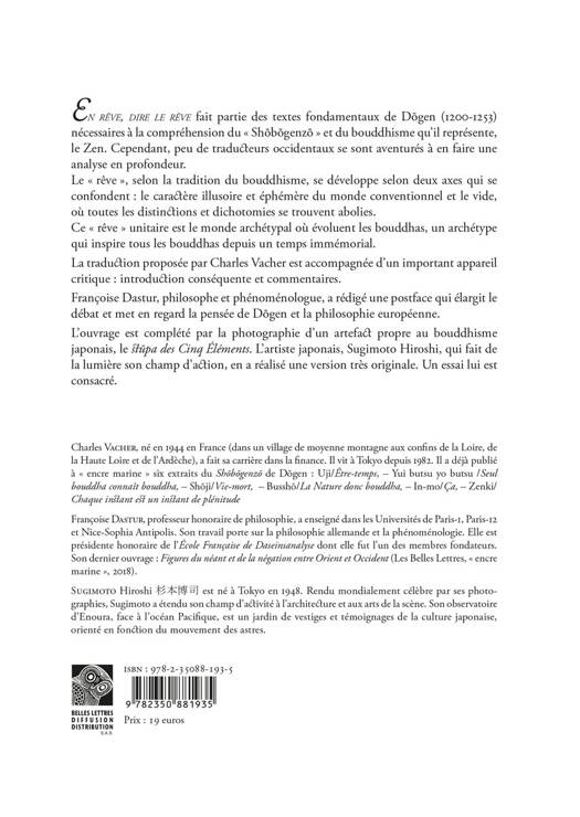 En reve, dire le reve fait partie des textes fondamentaux de Dogen (1200-1253) necessaires a la comprehension du Shobogenzo et du bouddhisme qu'il represente, le Zen. Cependant, peu de traducteurs occidentaux se sont aventures a en faire une analyse en profondeur. Le reve, selon la tradition du bouddhisme, se developpe selon deux axes qui se confondent: le caractere illusoire et ephemere du monde conventionnel et le vide, ou toutes les distinctions et dichotomies se trouvent abolies. Ce reve unitaire est le monde archetypal ou evoluent les bouddhas, un archetype qui inspire tous les bouddhas depuis un temps immemorial. La traduction proposee par Charles Vacher est accompagnee d'un important appareil critique: introduction consequente et commentaires. Francoise Dastur, philosophe et phenomenologue, a redige une postface qui elargit le debat et met en regard la pensee de Dogen et la philosophie europeenne. L'ouvrage est complete par la photographie d'un artefact propre au bouddhisme japonais, le stupa des Cinq Elements. L'artiste japonais, Sugimoto Hiroshi, qui fait de la lumiere son champ d'action, en a realise une version tres originale. Un essai lui est consacre.