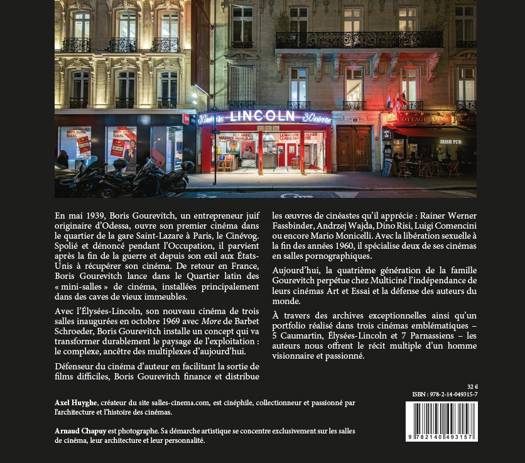 En mai 1939, Boris Gourevitch, un entrepreneur juif originaire d’Odessa, ouvre son premier cinéma dans le quartier de la gare Saint-Lazare à Paris, le Cinévog. Spolié et dénoncé pendant l’Occupation, il parvient après la fin de la guerre et depuis son exil aux États-Unis à récupérer son cinéma. De retour en France, Boris Gourevitch lance dans le Quartier latin des « mini-salles » de cinéma, installées principalement dans des caves de vieux immeubles. Avec l’Élysées-Lincoln, son nouveau cinéma de trois salles inaugurées en octobre 1969 avec More de Barbet Schroeder, Boris Gourevitch installe un concept qui va transformer durablement le paysage de l’exploitation : le complexe, ancêtre des multiplexes d’aujourd’hui. Défenseur du cinéma d’auteur en facilitant la sortie de films difficiles, Boris Gourevitch finance et distribue les œuvres de cinéastes qu’il apprécie : Rainer Werner Fassbinder, Andrzej Wajda, Dino Risi, Luigi Comencini ou encore Mario Monicelli. Avec la libération sexuelle à la fin des années 1960, il spécialise deux de ses cinémas en salles pornographiques. Aujourd’hui, la quatrième génération de la famille Gourevitch perpétue chez Multiciné l’indépendance de leurs cinémas Art et Essai et la défense des auteurs du monde. À travers des archives exceptionnelles ainsi qu’un portfolio réalisé dans trois cinémas emblématiques – 5 Caumartin, Élysées-Lincoln et 7 Parnassiens – les auteurs nous offrent le récit multiple d’un homme visionnaire et passionné.