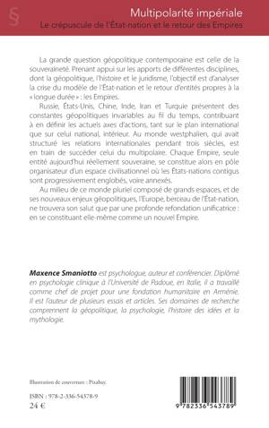 La grande question géopolitique contemporaine est celle de la souveraineté. Prenant appui sur les apports de différentes disciplines, dont la géopolitique, l'histoire et le juridisme, l'objectif est d'analyser la crise du modèle de l'État-nation et le retour d'entités propres à la longue durée les Empires. Russie, États-Unis, Chine, Inde, Iran et Turquie présentent des constantes géopolitiques invariables au fil du temps, contribuant à en définir les actuels axes d'actions, tant sur le plan international que sur celui national, intérieur. Au monde westphalien, qui avait structuré les relations internationales pendant trois siècles, est en train de succéder celui du multipolaire. Chaque Empire, seule entité aujourd'hui réellement souveraine, se constitue alors en pôle organisateur d'un espace civilisationnel où les États-nations contigus sont progressivement englobés, voire annexés. Au milieu de ce monde pluriel composé de grands espaces, et de ses nouveaux enjeux géopolitiques, l'Europe, berceau de l'État-nation, ne trouvera son salut que par une profonde refondation unificatrice en se constituant elle-même comme un nouvel Empire.
