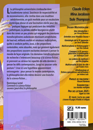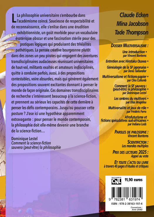 Porté par le philosophe des sciences et des techniques, directeur de recherches au Commissariat à l’énergie atomique, Vincent Bontems, le dossier au cœur de ce numéro 120, ambitieux, propose d’aborder de nouvelles façons d'envisager le futur, et de fait les problématiques de notre présent : le Multiversalisme, donc, à travers une série d’articles vivifiants destinés à explorer ces nouvelles voix. Au sommaire, des essais et entretiens avec et de : Hirotaka Osawa, qui a organisé le premier Congrès des études de l’imagination et du Multiversalisme à l’Université Keio, à Yokohama, le 10 et 11 juin dernier 2025 ; la philosophe Cléo Collomb, qui explore l’œuvre d’Ursula Le Guin et son approche multiverselle à travers le concept de fictions-panier ; le philosophe Dominique Lestel, qui livre un percutant essai, « Pourquoi la science-fiction sauvera (peut-être) la philosophie » ;  le chercheur Elias Brugidou, qui propose une étude passionnante sur la façon dont l’extrême droite récupère les idées de la science-fiction ; ou encore Indiana Lods, spécialiste de la littérature anglophone du XXIe siècle, qui s’intéresse ici aux littératures spéculatives sud-africaines et afro-américaines. Sans oublier quelques autres surprises, bien entendu…
