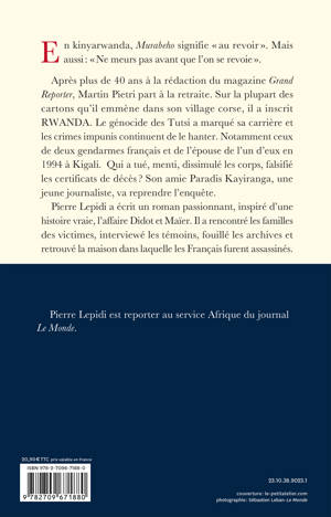 En kinyarwanda, Murabeho signifie « au revoir ». Mais aussi : « Ne meurs pas avant que l’on se revoie ». Après plus de 40 ans à la rédaction du magazine Grand Reporter, Martin Pietri part à la retraite. Sur la plupart des cartons qu’il emmène dans son village corse, il a inscrit RWANDA. Le génocide des Tutsi a marqué sa carrière et les crimes impunis continuent de le hanter. Notamment ceux de deux gendarmes français et de l’épouse de l’un d’eux en 1994 à Kigali. Qui a tué, menti, dissimulé les corps, falsifié les certificats de décès ? Son amie Paradis Kayiranga, une jeune journaliste, va reprendre l’enquête.