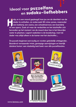 Help, er is een moord gepleegd! Aan jou om de identiteit van de dader te onthullen. Je onderzoekt 80 crime scenes, waaronder een bakkerij, een casino, een schaaktoernooi, een boerderij en een opera. Zoek uit waar de verdachten en het slachtoffer zich bevonden op het moment van de moord door hen in het kleurrijke raster te plaatsen. Logisch nadenken is de boodschap, want de dader was altijd alleen in de kamer met het slachtoffer...