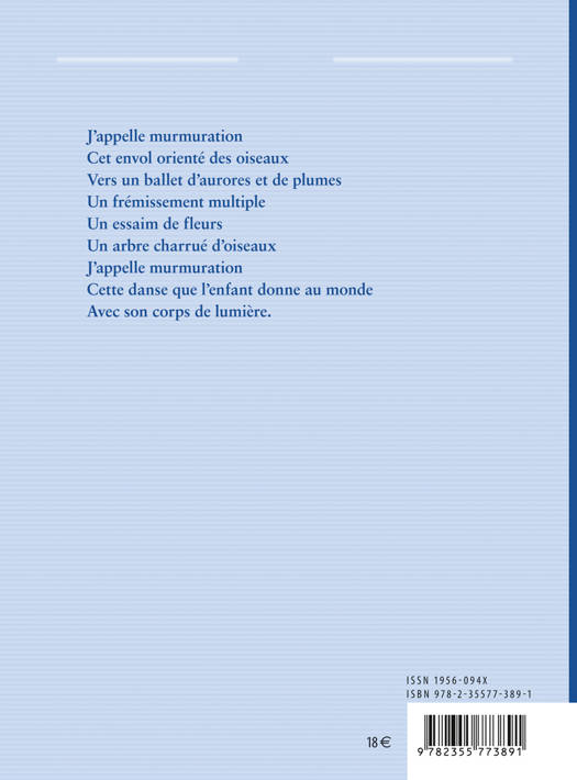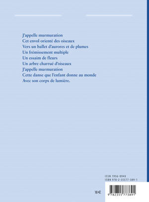 Retrouver des mots après la mort / Un langage de bête et de feuille / Et faire un poème avec sa bave de chenilleLe recueil se déploie en douze parties qui explorent les mots, les écrire et les dire dans leur apparition : mumurations, l’enfant, les oiseaux, les arbres, les entendre, les voir, les écrire.
